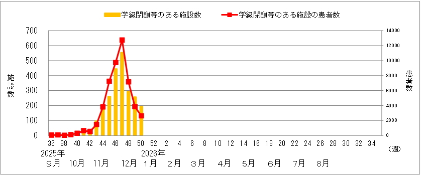 第50週に学級閉鎖等5のあった保育所・学校等は193施設、患者数は2,616名でした。
