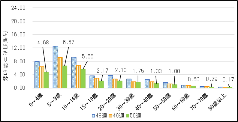 2025年第50週は、80歳以上を除く全ての年齢群で、前週に比べて定点当たり報告数が減少しました。