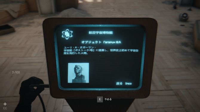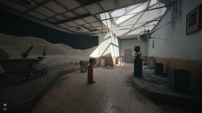短いムービーが終わると、さっそく実際にプレイできます。建物内は雑然としており、宇宙飛行士の壁画人工衛星の模型などが飾られています。きっと戦争前は、宇宙に関する資料館として運営されていたのでしょう。