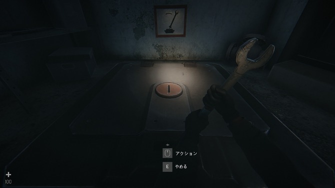 奥へ進んでいくと、固く閉ざされた地下扉がありました。インベントリから「改造レンチ」を取り出します。道具を使ったアクションはプレイヤー自ら操作する必要があり、スティックを左右に動かしてこじ開けていきます。このように、行動のすべてがプレイヤーに委ねられているため、ゲームへの没入感や一体感がとても高いところも本作の魅力でした。