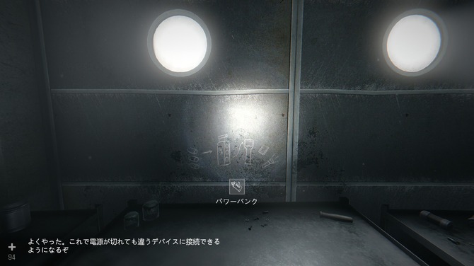 またパワーバンクは、謎解きにも使えます。地下シェルターの一角にあやしげな金庫があったので開けたいところですが、暗号が必要です。