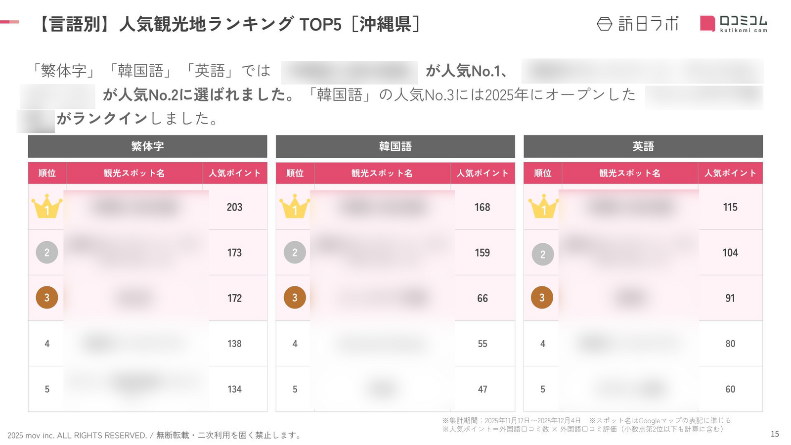 インバウンド人気観光地ランキング[沖縄県 編]では、以下の内容が明らかになりました。