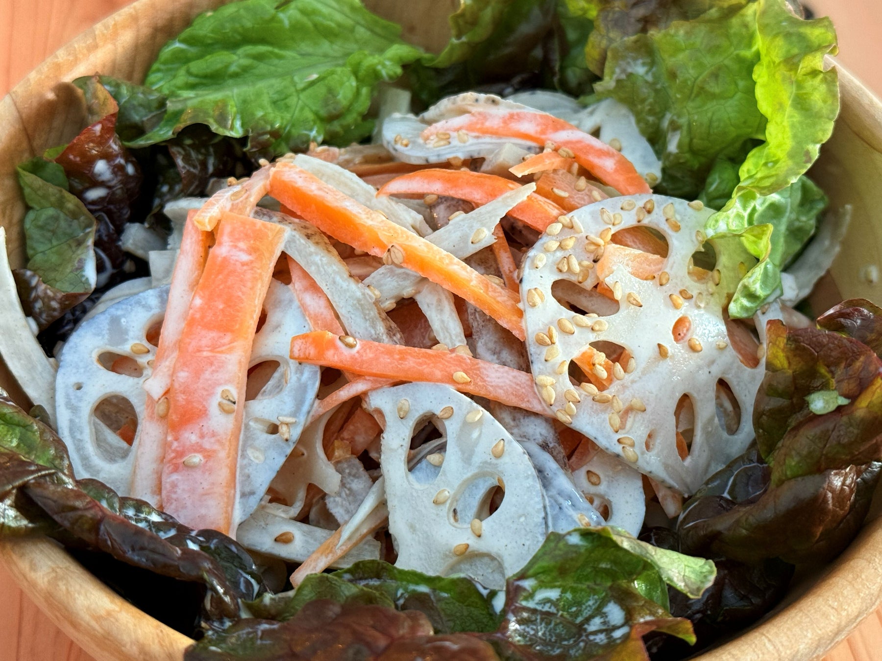 地場産フレッシュサラダに蓮根・ゴボウ・人参をマヨネーズ和えにしてトッピング。