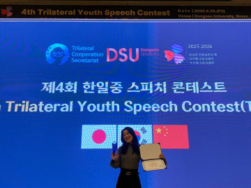 二つのプログラムを経て、2025年5月のスピーチコンテストには、自分の語学力を試すために挑戦しました。与えられた題は「共に歩む今日、成長する未来:日中韓交流ストーリー」で、自分で自由に発想すること。これに対して、私は「似て非なる 日中韓の若者交流におけるプラットフォームの重要性」 というテーマを設定し、「情報が氾濫する現代だからこそ、その情報の真偽を見極めて理解するためのプラットフォームの存在が、国々の対話や協力の促進において重要」という内容のスピーチをしました。TCSの李熙燮(い・ひそぷ)事務総長をはじめ、三国を代表する来賓の方々に審査していただき、コンテスト終了後には、人生経験や国際的な舞台で働く意義について直接伺うことができました。一位を受賞したことで語学への自信も付きましたし、大変光栄な機会でしたね。