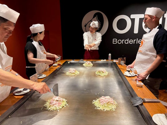 その上で、オタフクソース様が広島駅で運営するお好み焼体験スタジオ「OKOSTA(オコスタ)」にて、お好み焼づくりを体験。広島人として普段味わうお好み焼の奥深さをより体感し、味わいの開発につなげています。