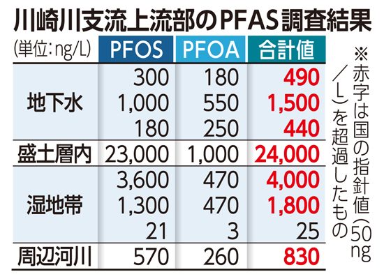 沖縄県環境整備課は22日までに、沖縄市内の川崎川支流の上流にある湿地帯などを調べたところ、有害性が指摘されている有機フッ素化合物(PFAS)が、地下水などの国の指針値(当時は暫定。1リットル当たりPFOS・PFOA合計50ナノグラム)を大きく超える高濃度で検出されたと発表した。8地点中7地点で指針値を超え、最大値は基準の480倍の2万4000ナノグラムだった。汚染源や原因は特定できていない。