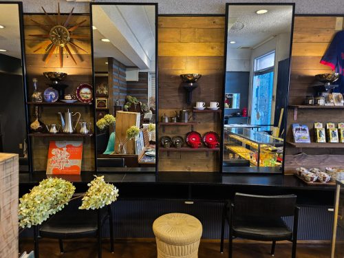 店内にある大きな鏡は、美容室だった頃の面影をそのまま残したもの。新しい雰囲気の中にも、当時の記憶がそっと息づいています。