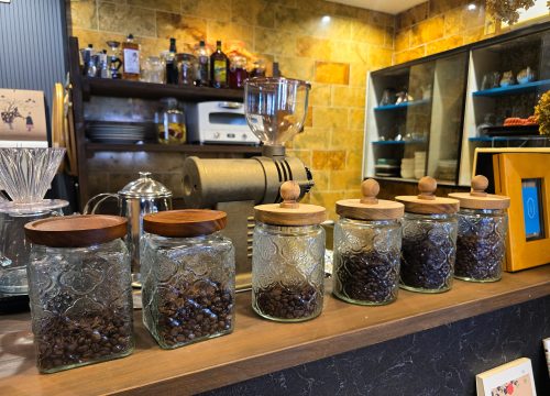 以前はコーヒー会社に勤めていた店主が、自らブレンドしたこだわりの豆を並べています。