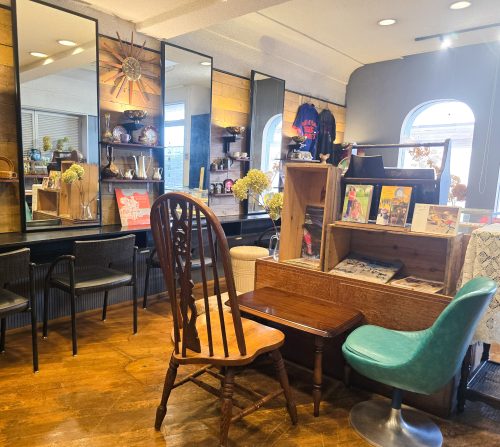 店内は、新しい雰囲気の中にも、美容室だった頃の面影がそっと残り、当時の記憶が息づいています。オーナーの琴線に触れたビンテージ雑貨もずらりと並び、見るだけでも楽しい空間です。