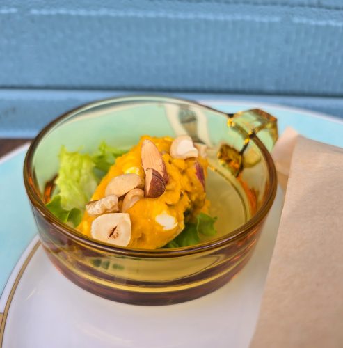 サラダは「ピーナッツかぼちゃと木の実とさつまいも」。一口ごとにピーナッツの食感が楽しめ、かぼちゃの甘さがクリームチーズとハチミツでまろやかに引き立てられています。