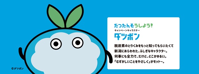 新潟県は、2050年までに二酸化炭素などの温室効果ガス排出量の実質ゼロ、2030年度までに2013年度比46%削減という目標を掲げています。新潟日報社は、県民の脱炭素に関する意識・行動の変容を促そうと、「ダツボン」というキャラクターを起用するなど、親しみやすく、分かりやすい情報発信に取り組まれています。