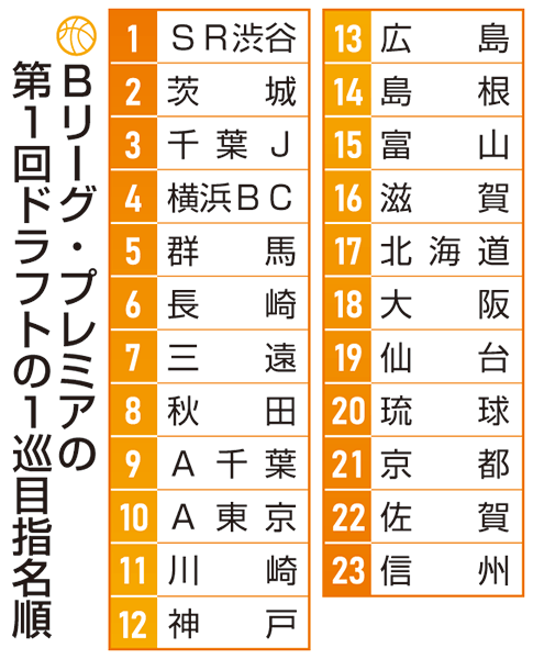 プロバスケットボールBリーグ1部の琉球ゴールデンキングスは22日、新1部「Bリーグ・プレミア(Bプレミア)」の第1回新人ドラフト(来年1月29日)への参加を発表した。優先により、キングスの指名順位は第1巡の全体20位に決まった。プレミア参入の26クラブ中、今回の参加を見送った宇都宮、三河、名古屋D以外の23クラブで選手指名を行う。
