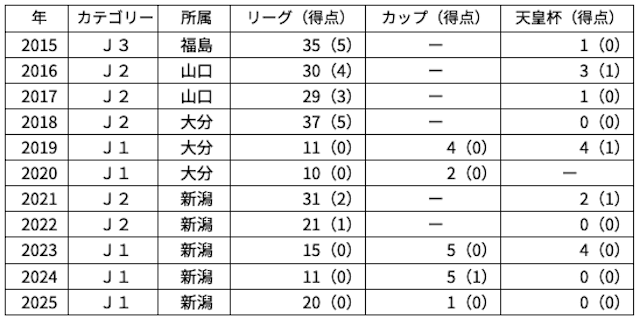 J1リーグ通算:67試合出場0得点、J2リーグ通算:148試合出場15得点、J3リーグ通算:35試合出場5得点、カップ戦通算:17試合出場1得点、天皇杯通算:15試合出場3得点