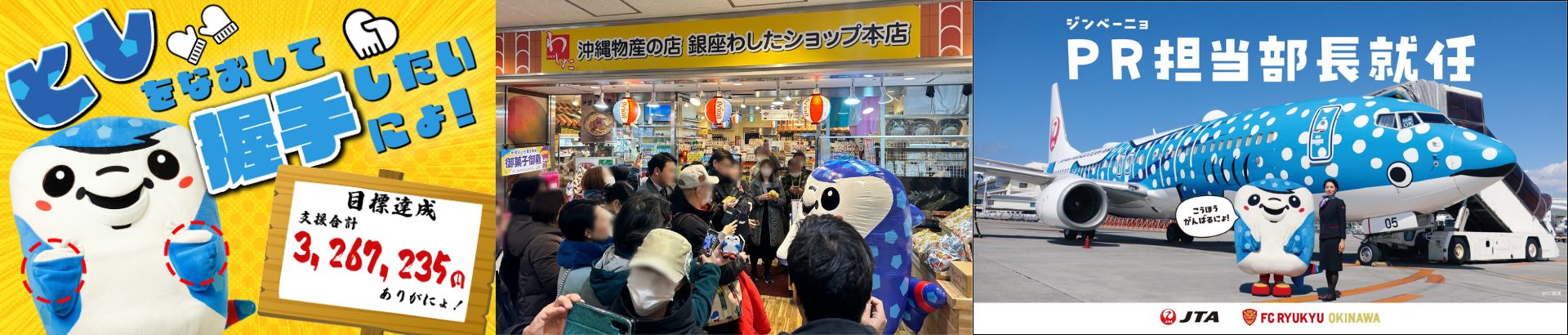 ジンベーニョは、沖縄を代表するマスコットとなるべく昨シーズン以上に活発に活動し、さまざまな話題を提供してきました。今年2月には、サポーターと握手を交わすために“ヒレを改修する”というクラウドファンディングを実施。結果として、全国各地から320万円を超えるご支援をいただき、大きな反響を呼びました。さらに、ジンベーニョグッズを取り扱う販売店舗は昨シーズンの7店舗から、全国各地の20店舗にまで拡大。銀座や大阪など沖縄県外での出張にも精力的に取り組み、現在は県外のファン層の拡大に向けて奮闘しています。これらの活動が注目を集め、今月には初めてメディアのインタビュー取材に対応。地元紙社会面・全国紙デビューを飾りました。