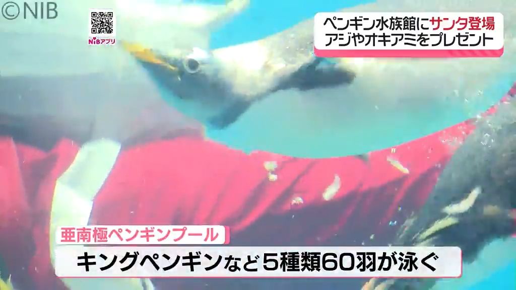 サンタクロースに扮したダイバーからペンギンたちへ、大好物のアジやオキアミのクリスマスプレゼントです。