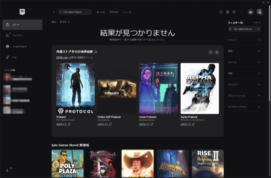 「Epic Games」アプリで「The Callisto Protocol」と検索してもヒットしない