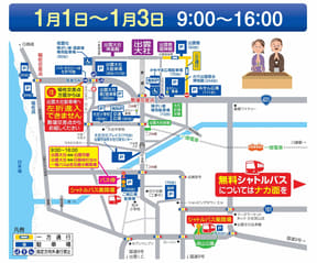 12月31日22時~1月1日4時と1日~3日の各日9時~16時は、古代出雲歴史博物館(休館中)周辺の道路を一部一方通行として運用。また1日~3日に限り、稲佐交差点方面(海側)から出雲大社大駐車場への左折入場を禁止し、勢溜交差点(大鳥居前)方面からの右折入場を必須とする(バス・タクシー除く)。