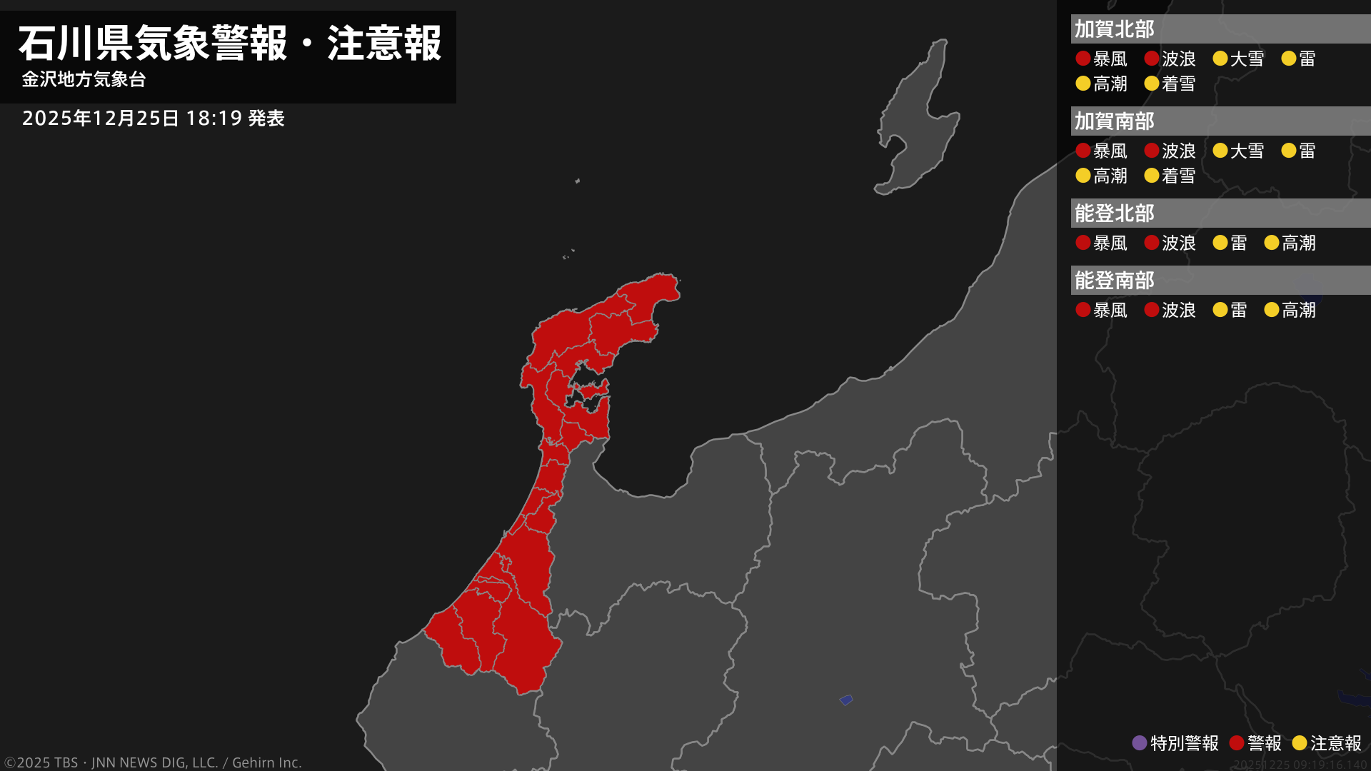 【暴風警報】石川県・金沢市、七尾市、小松市、輪島市、珠洲市、加賀市などに発表 25日18:19時点