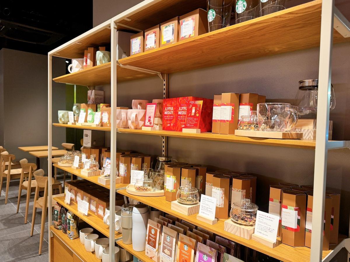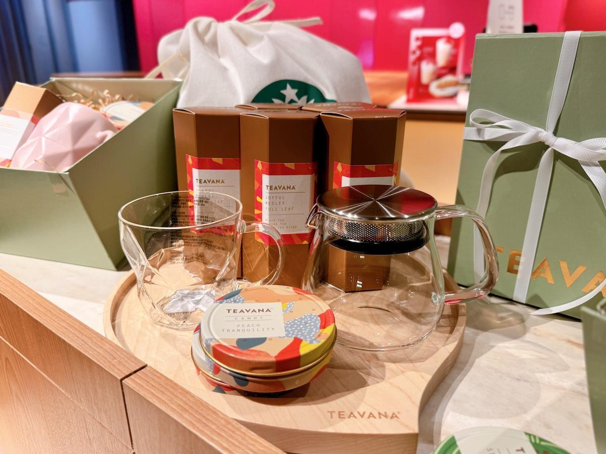 物販コーナーには、ティーブランド「TEAVANA」の茶葉がずらりと並び、実際に香りを試せるサンプルも用意されています。