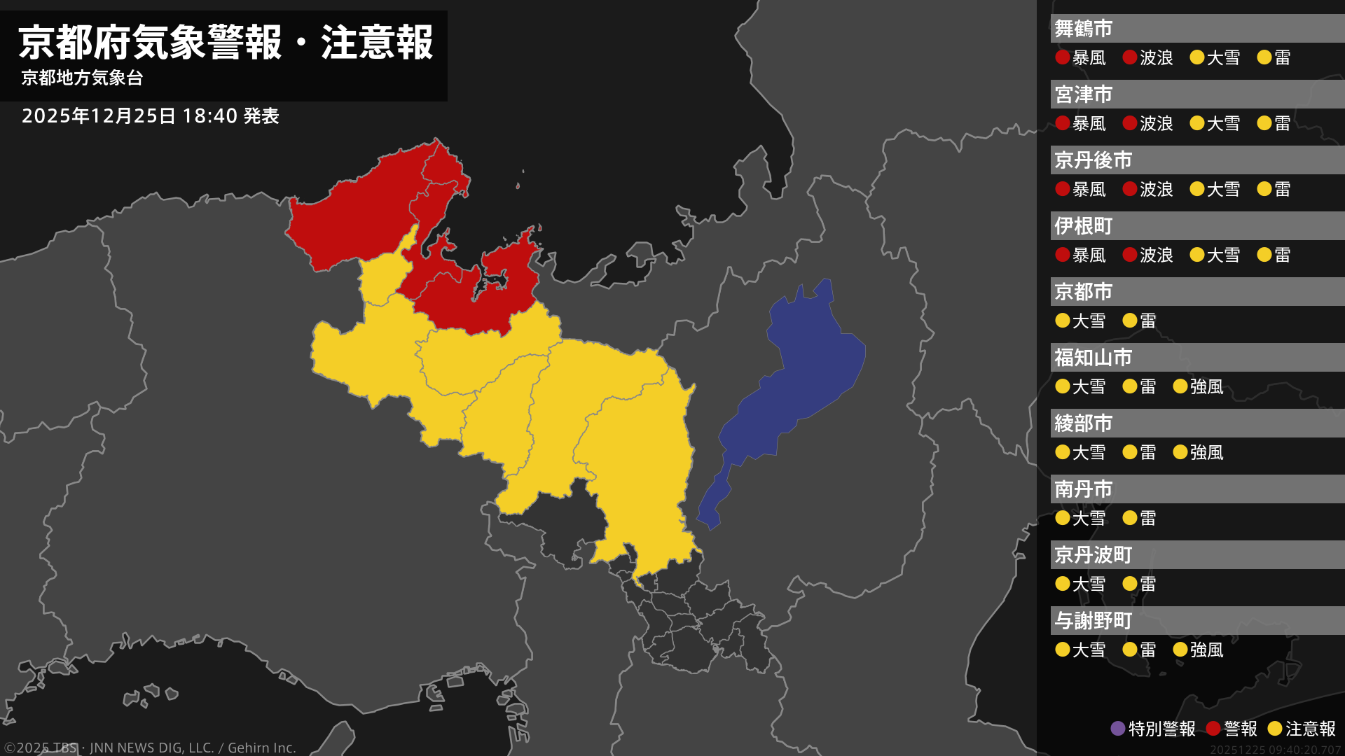 気象台は、午後6時40分に、波浪警報を舞鶴市、宮津市、京丹後市、伊根町に発表しました。