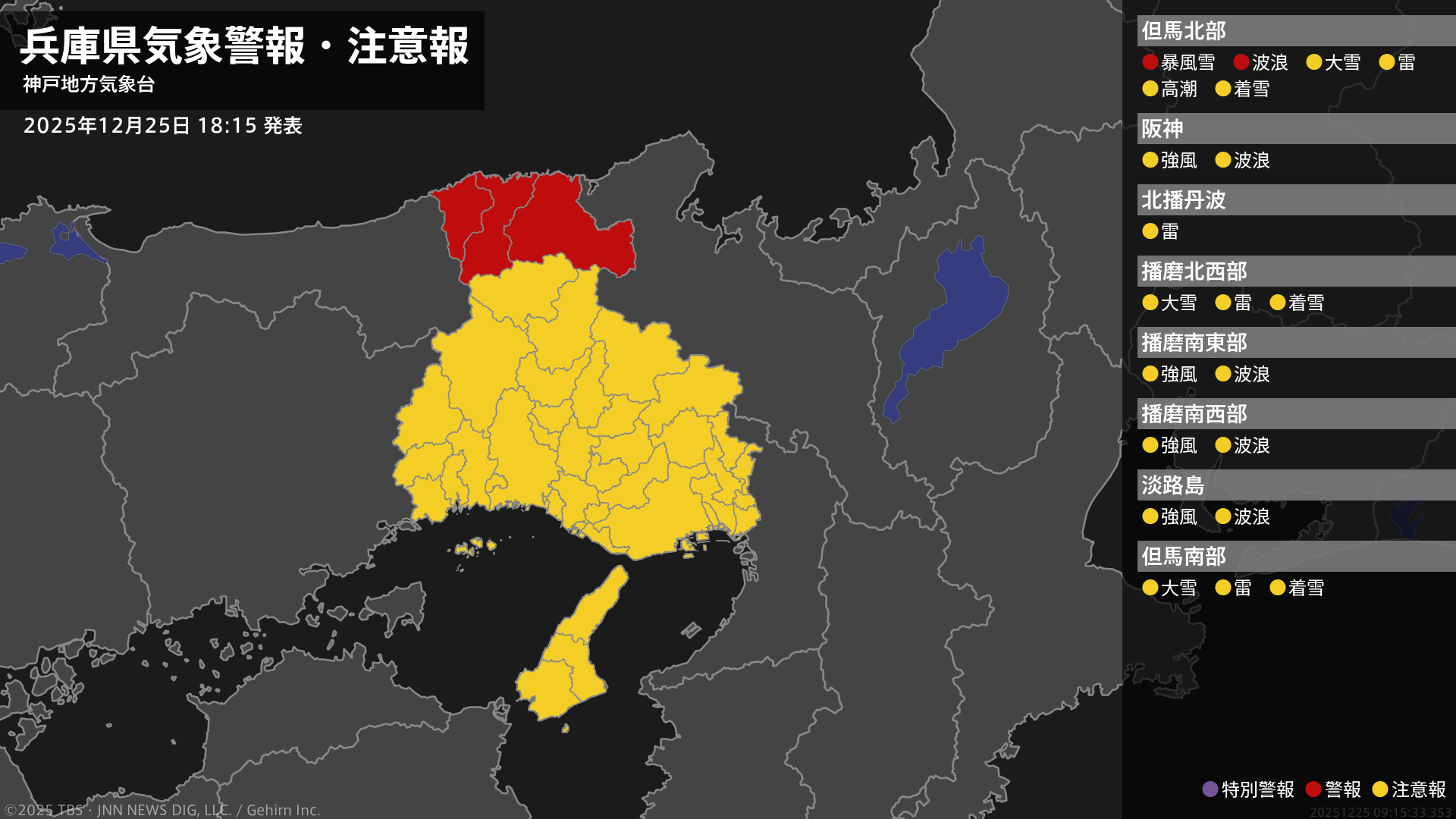【暴風雪警報】兵庫県・豊岡市、香美町、新温泉町に発表 25日18:15時点