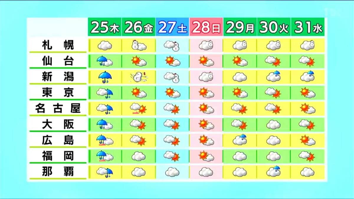 午前中は比較的降りにくいものの、湿気が多いため洗濯物は部屋干しするしかないでしょう。最高気温は24日より2度前後高く、平年よりも少し高めとなりそうです。