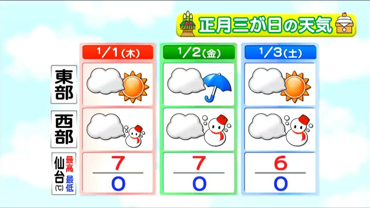 1月1日の元日は、東部では晴れ間があり、初日の出を見ることができそうです。しかし2日金曜日には南岸低気圧がやってくるような予報が出てきています。この低気圧によって天気が大きく崩れることも考えられますので、2日以降の予報に今後注意してください。