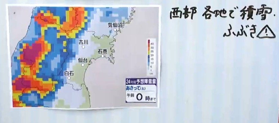 雪も西部を中心に降りやすくなり、西部では各地で新たに積雪となり、吹雪くところもあるでしょう。峠道の辺りでは10cm以上積雪が増えるところもありそうです。平地でも古川や気仙沼周辺では夕方以降雪が積もってくる可能性があります。
