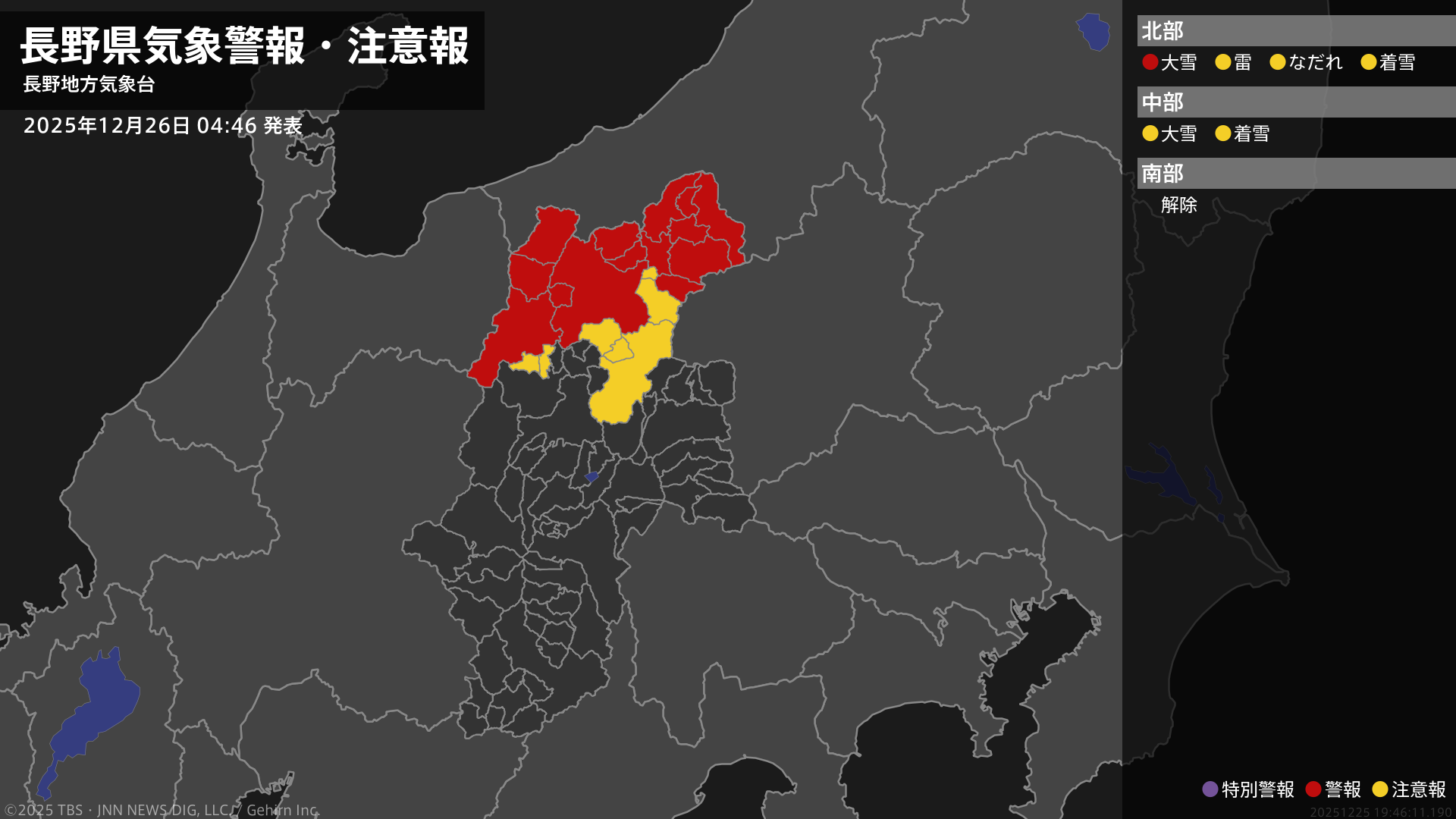 【大雪警報】長野県・長野市、中野市、大町市、飯山市、白馬村、小谷村などに発表 26日04:46時点