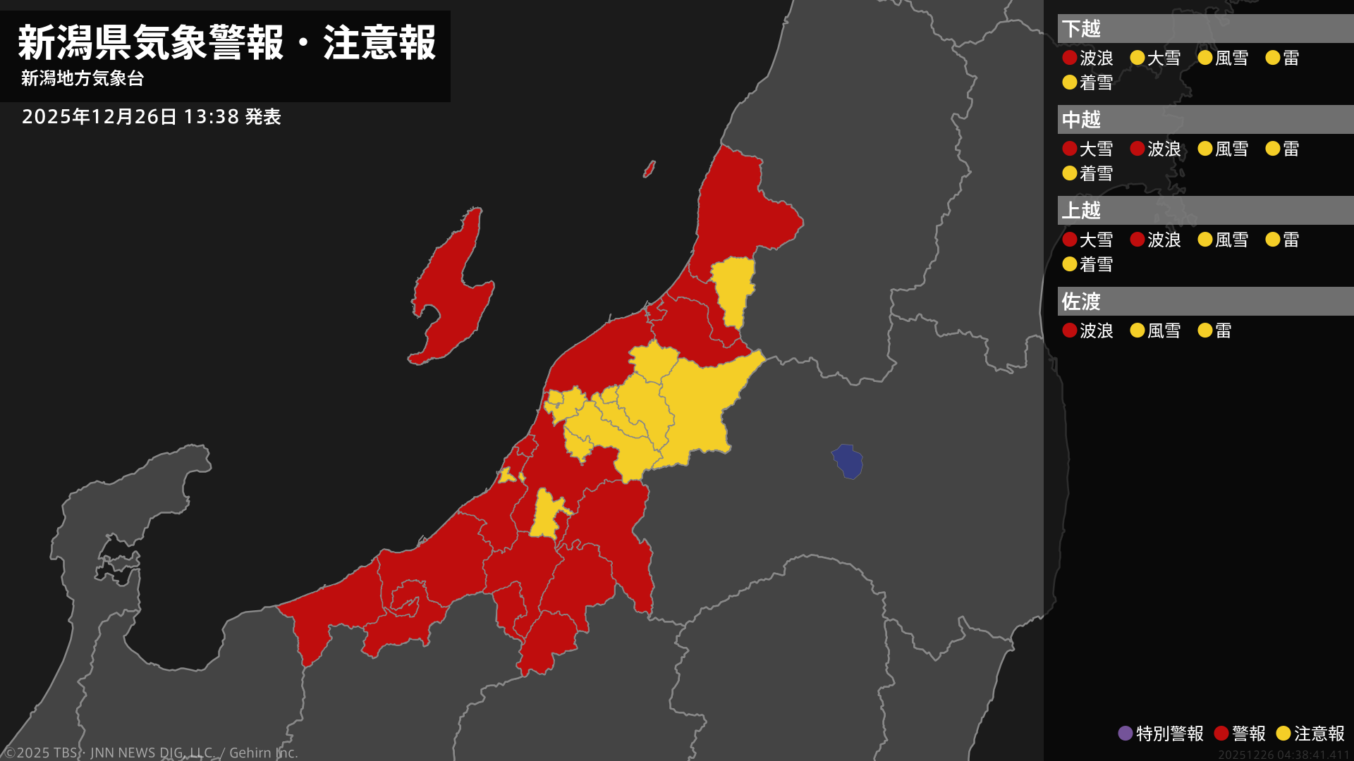中越、上越では、26日夕方から26日夜遅くまで大雪に警戒してください。中越、上越では26日夕方まで、下越、佐渡では27日未明まで、高波に警戒してください。