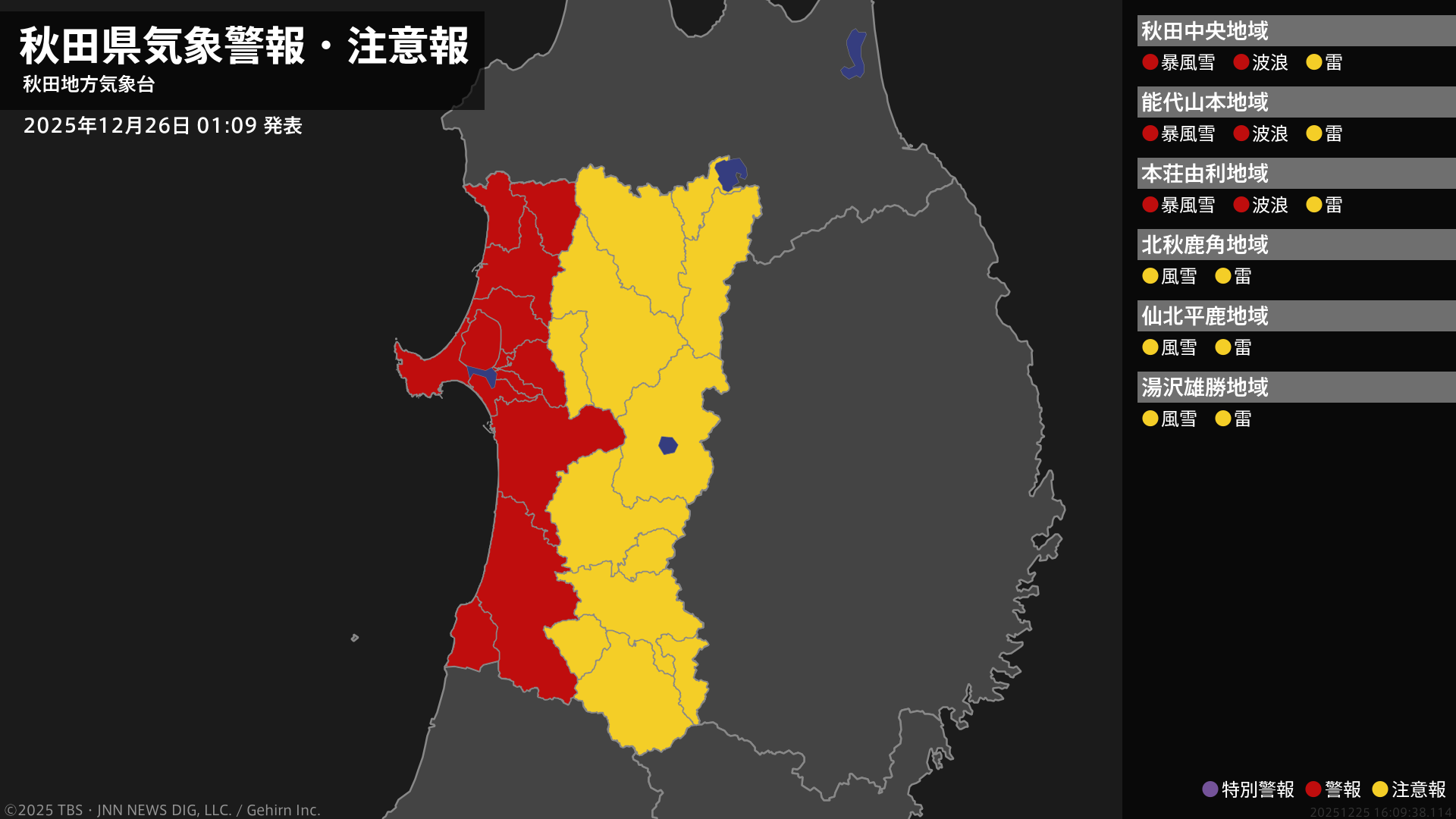 【波浪警報】秋田県・秋田市、能代市、男鹿市、由利本荘市、潟上市、にかほ市などに発表 26日01:09時点