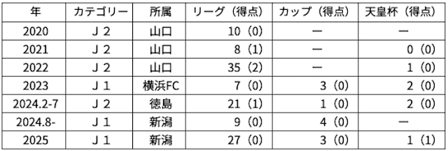 J1リーグ通算:43試合出場0得点、J2リーグ通算:74試合出場4得点