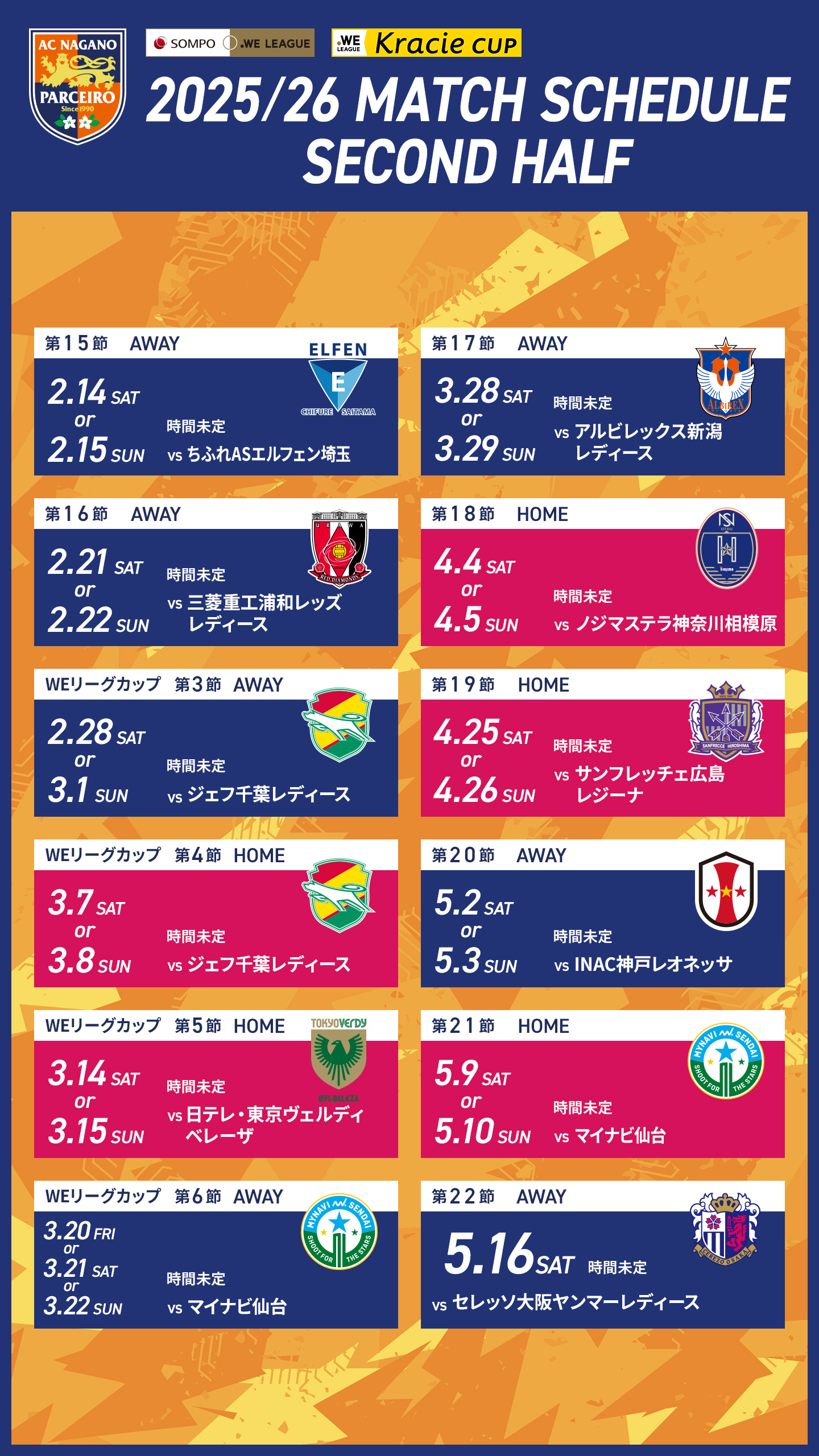 【PDF版はこちら】2025/26 SOMPO WEリーグ第15節~第22節、2025/26 WEリーグカップグループステージ 第3節~第6節 対戦カード