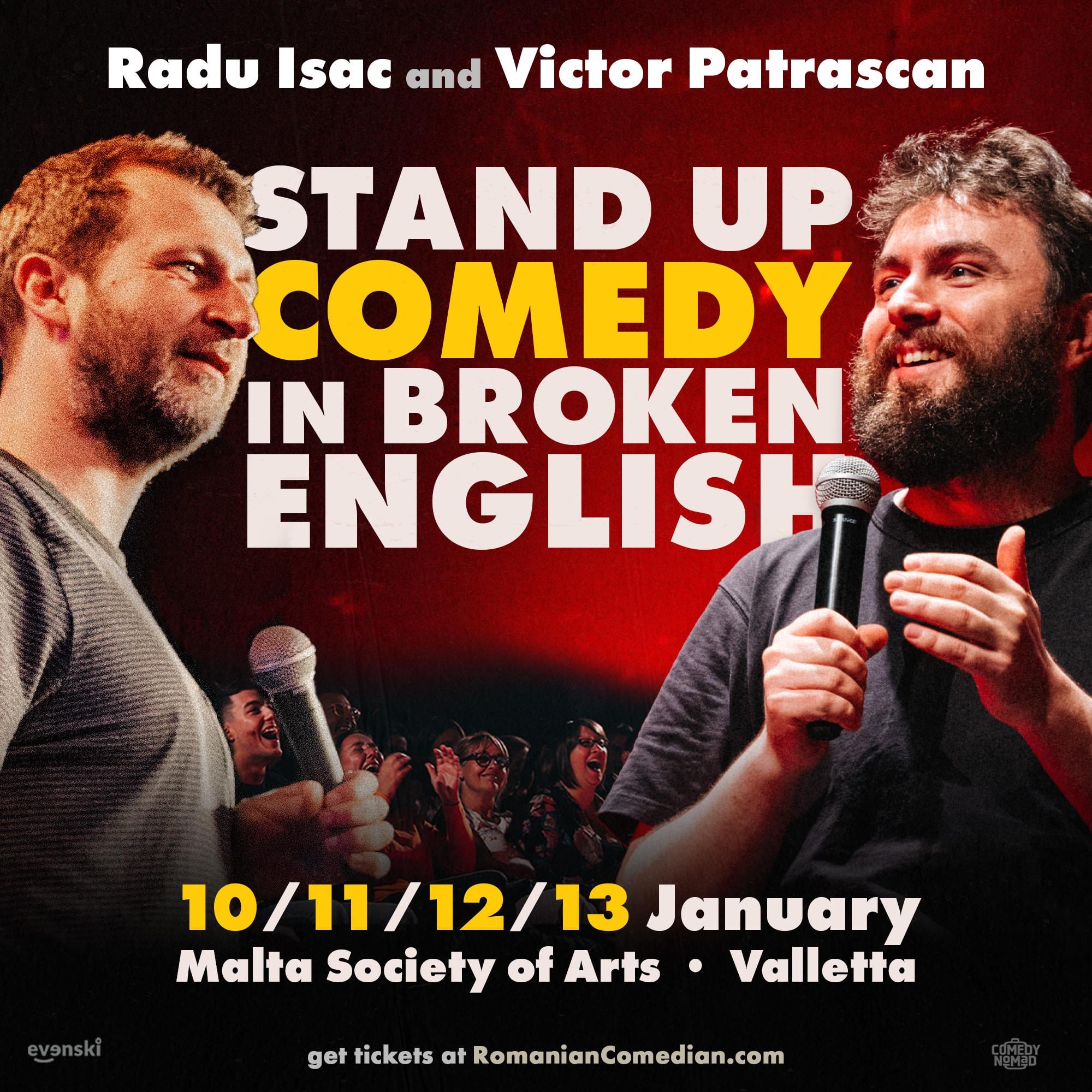 私と友人のラドゥはジョークを言うためにマルタに来ています。 これがあなたが探している種類のユーモアかどうかを確認するために、オンラインで私たちを検索してください。この番組は、簡単に犯罪を犯す人のためのものではありません。 でのチケット VictorPatrascan.com Malta