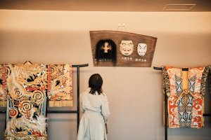 神話の国、出雲の地に受け継がれる伝統芸能「石見神楽」の華やかな衣装や神楽面の展示をじっくりと眺めるyUKIさん。
