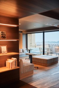 日本海へ沈みゆく太陽のオブジェがフロントでお出迎え。時々刻々と趣を変える深い海のような空間に身を置くうちに、心が調ってゆく“海色禊”がインテリアのテーマ。館内には地元作家が手掛けた作品が随所に散りばめられ、島根のものづくりや営み、日御碕の情景が伝わってくる。「大自然に抱かれるような感覚で、都会のリズムをスローダウンしてくれます」(yUKIさん)