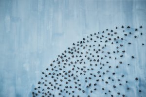 中世から受け継がれる伝統技法“たたら製鉄”によって生まれた太陽のオブジェ。中央に良質な日本刀の原料になる玉鋼を中央に配し、そのまわりを囲むのは鉄滓(ノロ)と呼ばれる玉鋼を作る過程で生まれる不純物。光が当たることのないものも同時にフォーカスすることで陰陽を表現した「鍛冶工房弘光」によるアートワーク。
