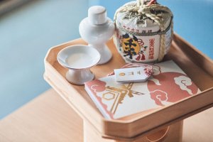 「出雲大社お詣り支度プラン」を予約すると、「参拝指南書」「出雲大社御神酒八千矛(やちほこ)」、出雲大社御本殿がデザインされた「オリジナル御朱印帳」、出雲大社素鵞の社で交換したお清めの砂を入れる「かみまもり」のお詣り支度セット4点をお部屋に用意されている。
