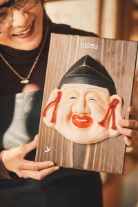 「持ってきていたメイク道具もプラスして、細かなニュアンスを仕上げました」(yUKIさん)。「福を招く伸び伸びとした表情を表現されていて、流石プロの技です」と柿田氏からもお褒めの言葉をいただいて、完成した恵比須さまのお面と記念撮影。