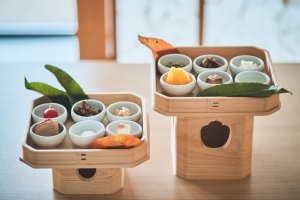 『出雲国風土記』に倣い地産の山海の珍味を神様へ献上する献立を再現した「神饌朝食」。こちらは「出雲大社お詣り支度プラン」予約者限定の朝食で、玄米、公魚、海士の塩、しじみ佃煮、日本酒などが並び、出雲大社へ出発する前に神縁がより強く結ばれることを祈願していただきたい。