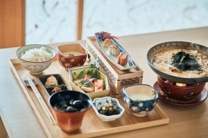 隠岐の島の名産、あらめやサザエなど海の幸を取り入れた「あらめ磯鍋」はじめ、山陰地方のソウルフードとして親しまれている赤天、しじみ汁などがいただける「ご当地朝食」。自家製のヨーグルトには、日本海の潮風が育てた多伎いちじくのジャムを添えて。