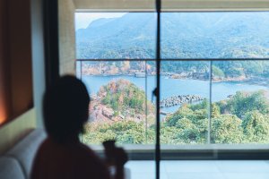 出雲松島と呼ばれる海を望むタイプと日御碕灯台を望むタイプの2種類の客室。移りゆく海や空の彩りに心が満たされるようにという想いが込められている。