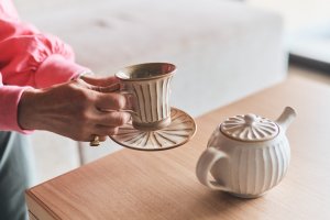 手仕事の温もりが感じられる親しみやすいカップ&ソーサーは、島根県雲南市の窯元「白磁工房」のもの。ライブラリーでも島根のものづくりの魅力に触れられる。