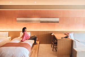 yUKIさんが宿泊したのは、朝日を眺められる海側のお部屋。朝の光と調和するように温もりあふれるピンク色の「石州和紙」で彩られている。寝室エリアのフォーカルポイントにもなっている「水平線」を表現したアートワークは、向かって右側が古くから石見地方の特産品として継承されてきた石州和紙を用いた「西田和紙工房」のもの、左側は100%楮の手漉き和紙を手紬ぎして生まれる“紙布”を用いた「結工房」によるもの。