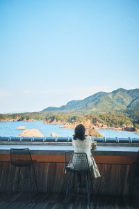 遮るものが何ひとつなく水平線まで見渡せる「かわたれテラス」は、日の出の時間を表す「彼は誰時」の情景が映えるロケーション。「波の音や潮の香りを感じながら、ゆっくりと心の声に耳を傾けることができました」(yUKIさん)。日本海に佇む出雲松島を眺めながら、想いのままに過ごしたい。