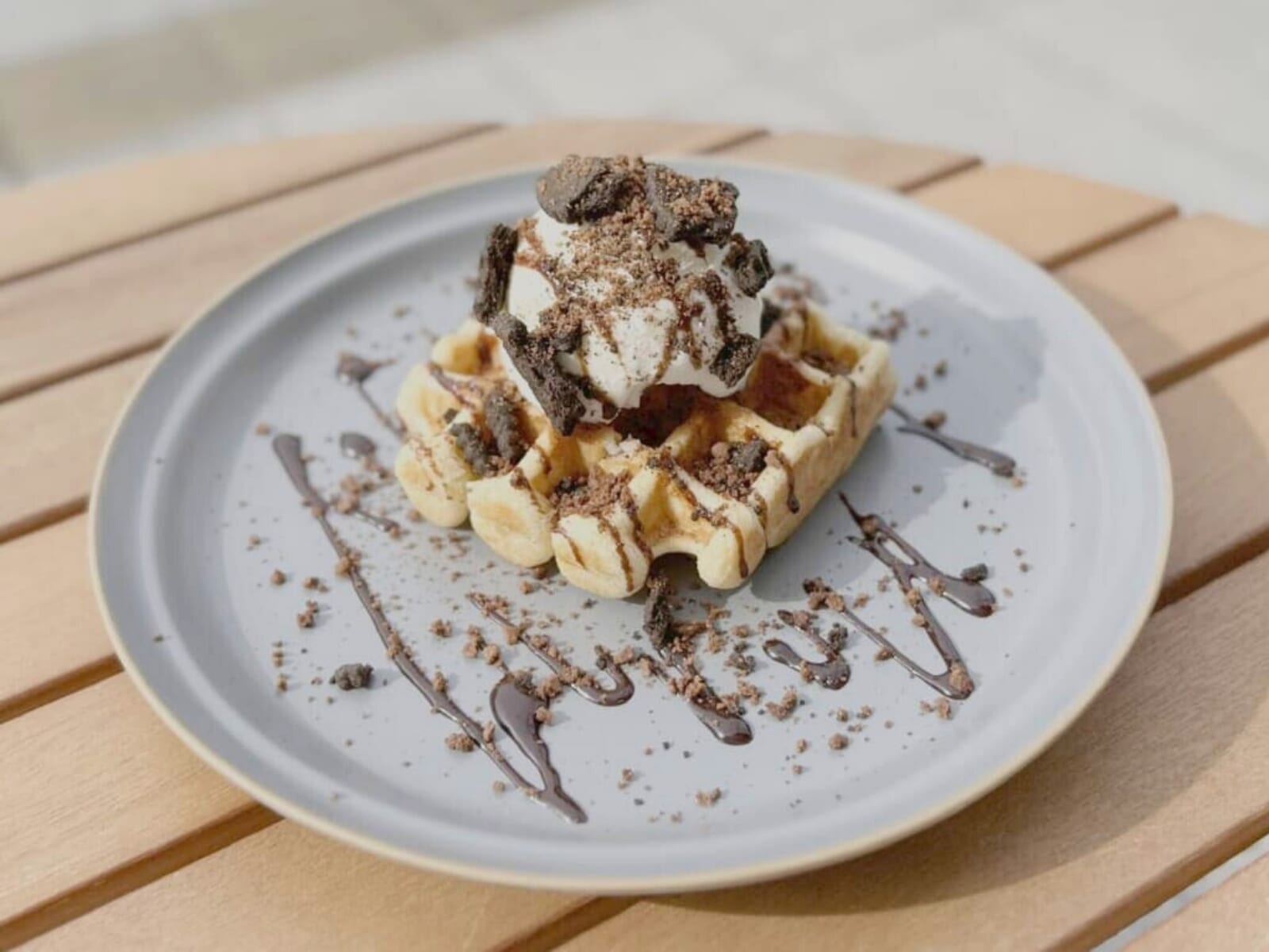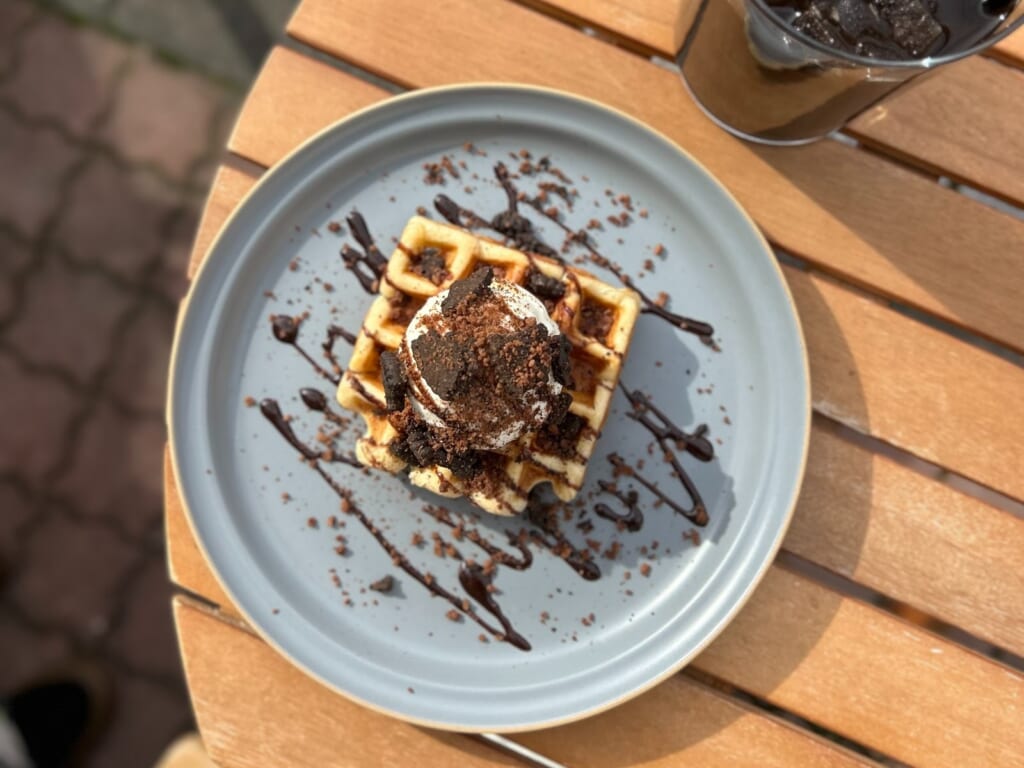 ” Rabbit Stand ” の人気フードのワッフル!なんといっても、ドリンク付きで500円でいただけるというお手頃価格が魅力。外はさくっと、中はふんわりした食感で食べやすく、上にはアイスクリームが添えられ、チョコレートソースがかかった見た目も可愛い一皿です。
