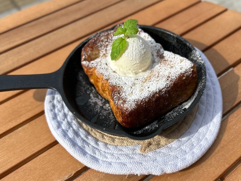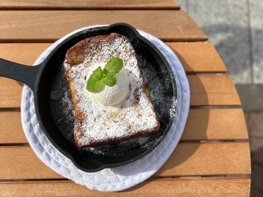 独自の手法で1日つけた山形食パン。表面は香ばしく焼き上げられ、とにかく存在感のある分厚さが目を引くフレンチトースト!ひと口頬張ると、ふんわりとした食感とやさしい甘さが広がります 。ボリュームがありながらも、甘さは控えめで、ブランチ利用にもぴったりの一品です♩