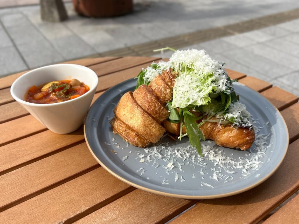 こちらは、12:00-15:00で提供されているランチメニュー。サクサクに焼き上げたクロワッサンに、自家製アボカドディップと平川鶏園の半熟卵とチーズを挟んだ、ボリューム満点の一皿です♩ヘルシーなのに満足度が高いので、お昼ご飯としてもおすすめです。