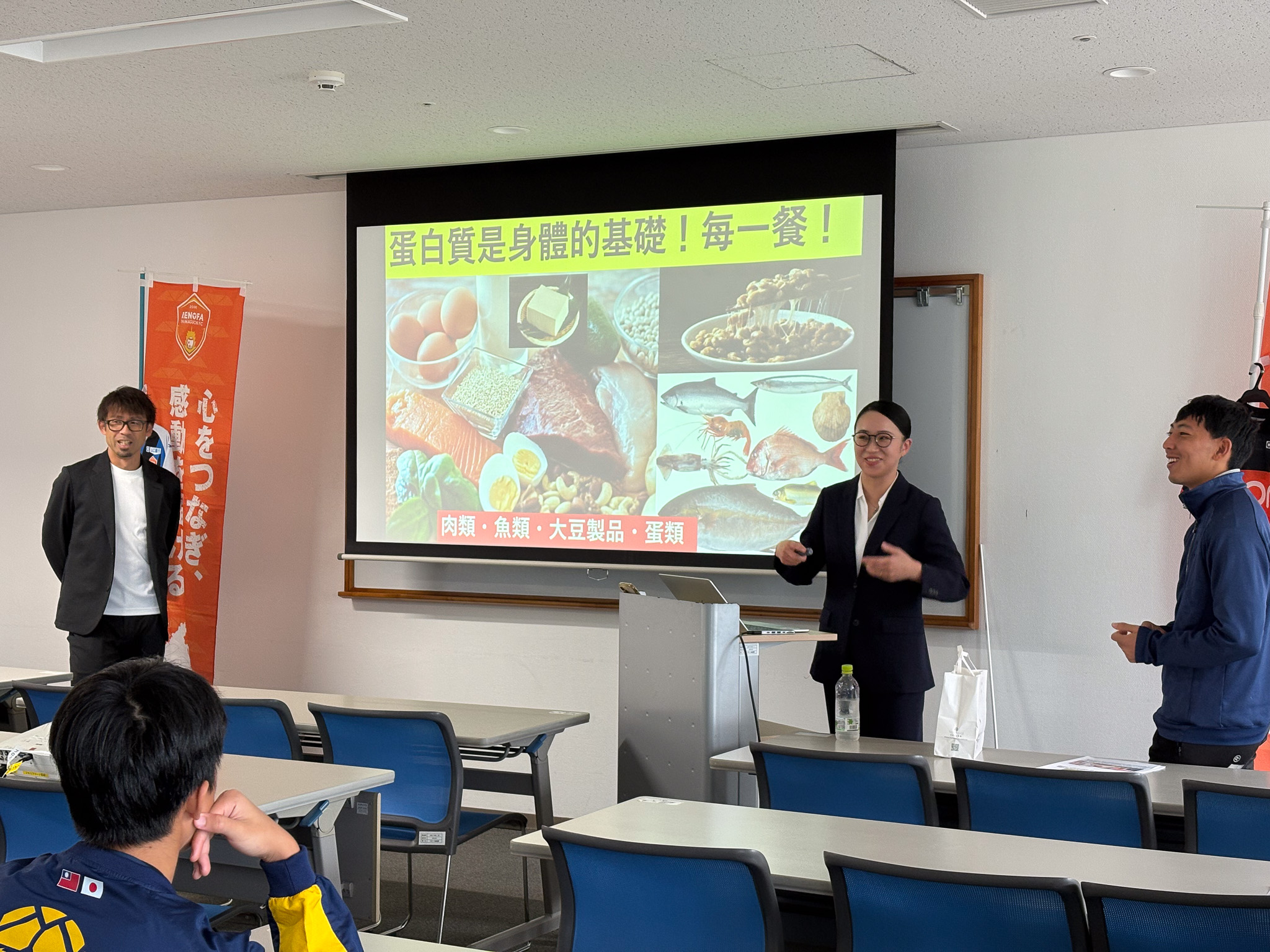 日本と台湾の食文化の違いにも触れながら、育成年代に大事な栄養素や料理例を交えたお話に、選手たちは真剣に耳を傾けていました。