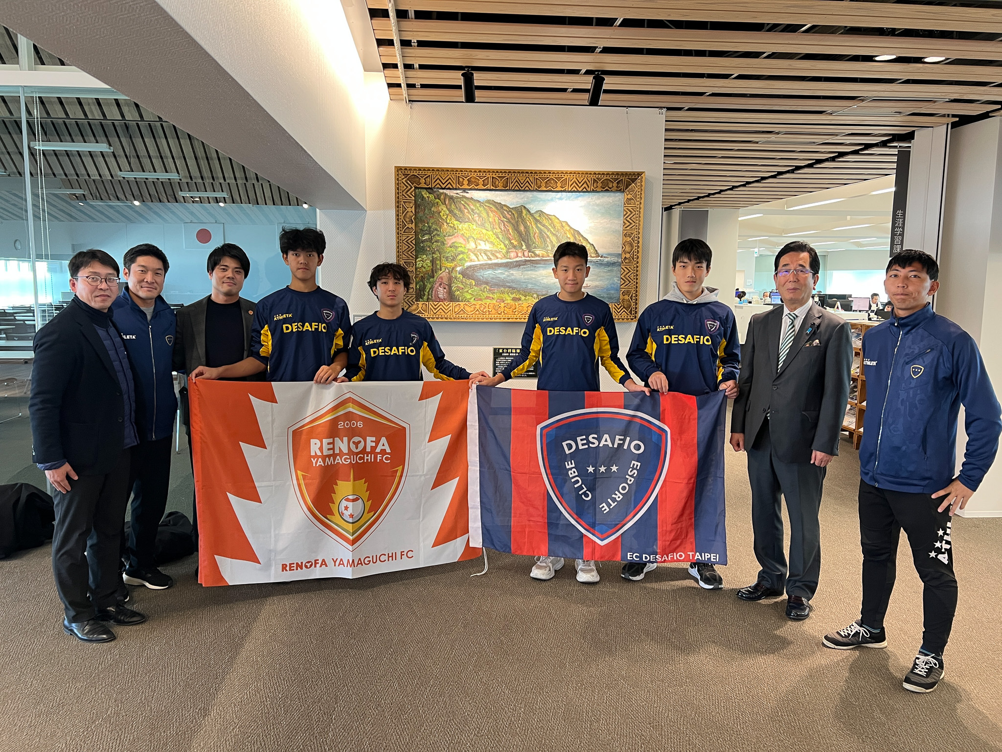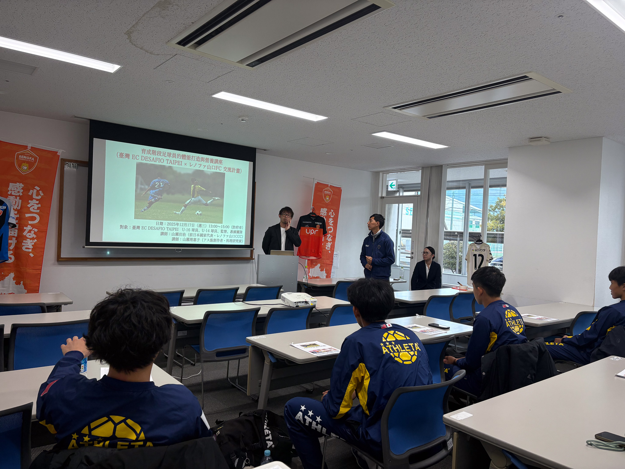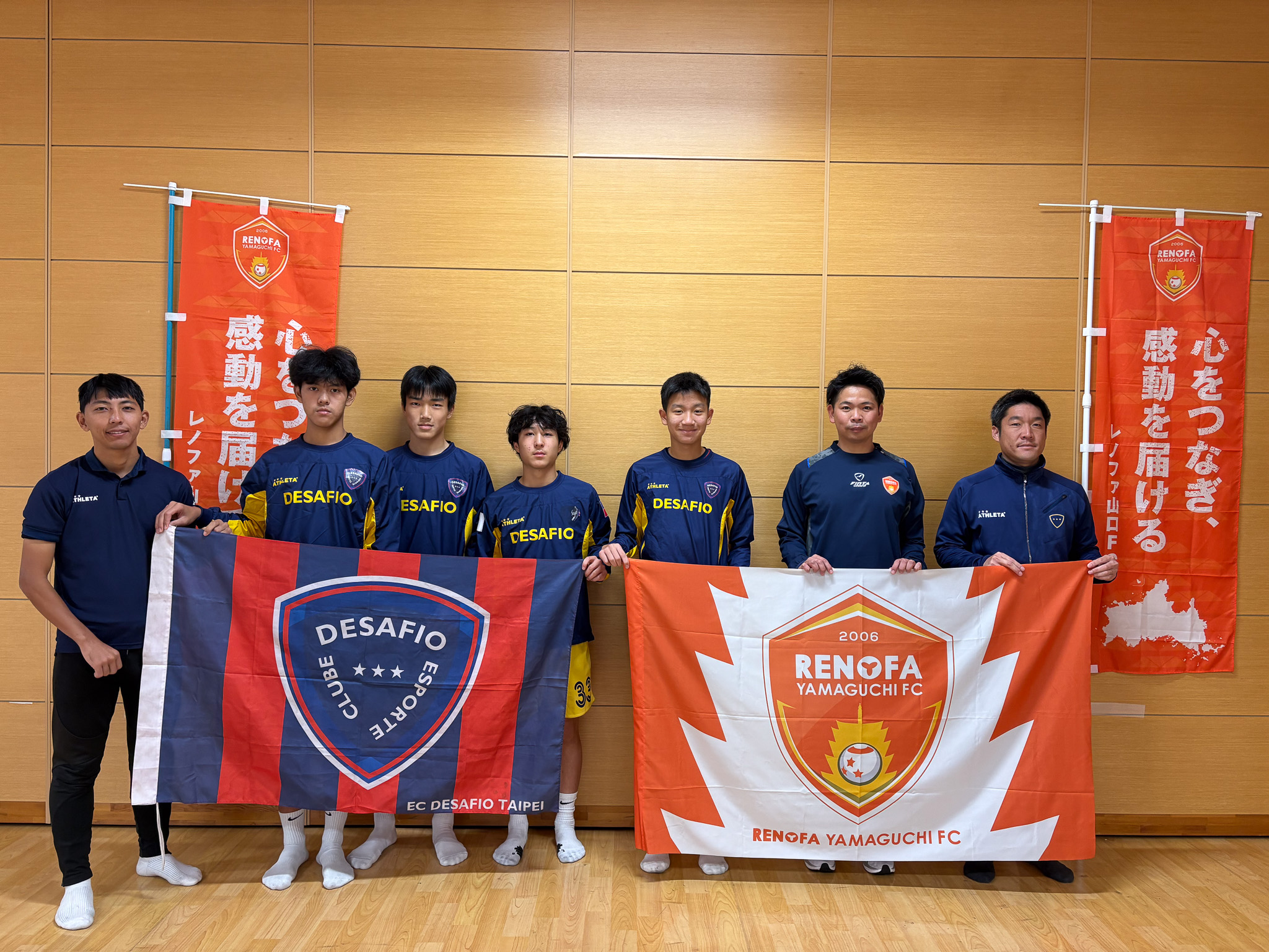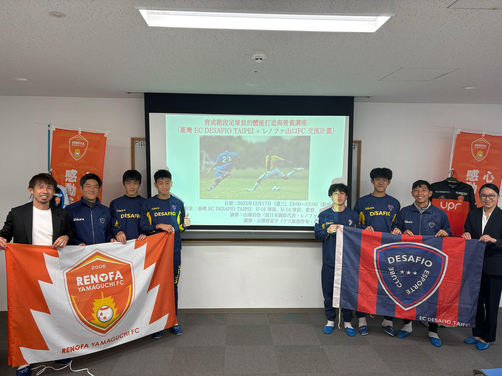 レノファ山口FCは、2025年12月15日(月)〜12月20日(土)の期間、台湾・台北市を拠点とするサッカーアカデミー「EC DESAFIO TAIPEI(代表:松下勇亮)」の選手・指導者を山口県に迎え、レノファ山口FCのアカデミー生や地域企業などとスポーツ交流プログラムを実施しました。本取り組みは、台湾との豊富な交流実績を持つ株式会社丸久様のご協力のもと実施しました。